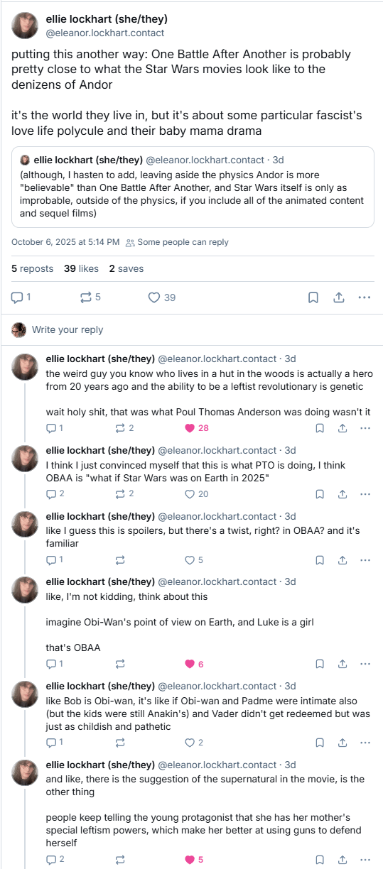 But I think Jim had a good point. And I think this ellie lockhart has a good point. The villains of Star Wars and One Battle after Another are both affectless creeps who hunt their own children. The heroes of both films have been hiding out and looking after kids as they grow to be teenagers, and now that they’re teenagers they can’t hide anymore, it’s time to run.